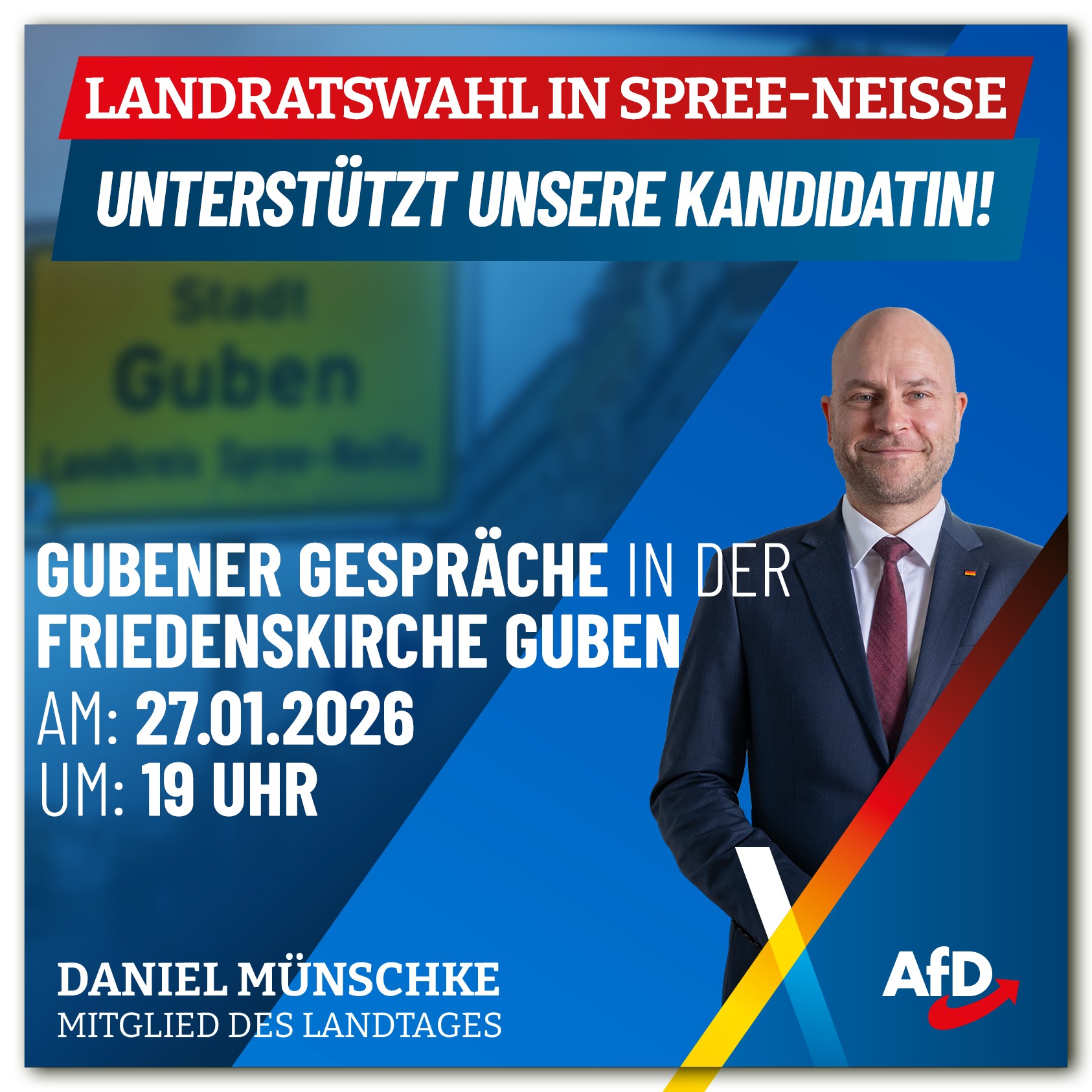 Am Dienstag, 27.01.2026, stellt sich unsere Kandidatin den Bürgern von Guben. Im Rahmen der „Gubener Gespräche – Kirche findet Stadt“ lädt der Ökumenische Stadtkonvent zu einem moderierten Vorstellungs- und Gesprächsabend