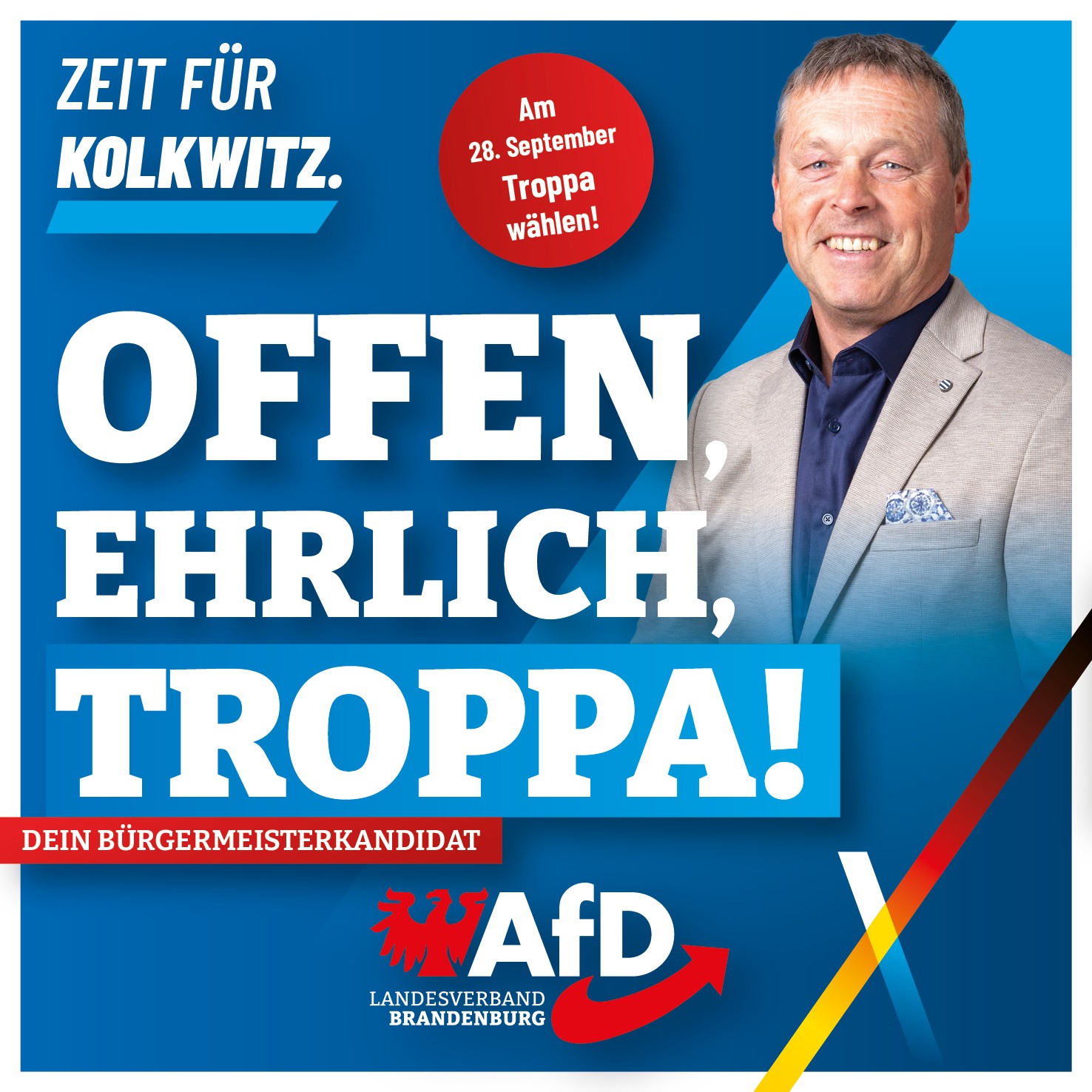 Offen. Ehrlich. Troppa! Am 28. September Steffen Troppa wählen! Beitrags-Navigation Zeit für einen AfD-Bürgermeister in Kolkwitz! Infostand in Krieschow zur Bürgermeisterwahl