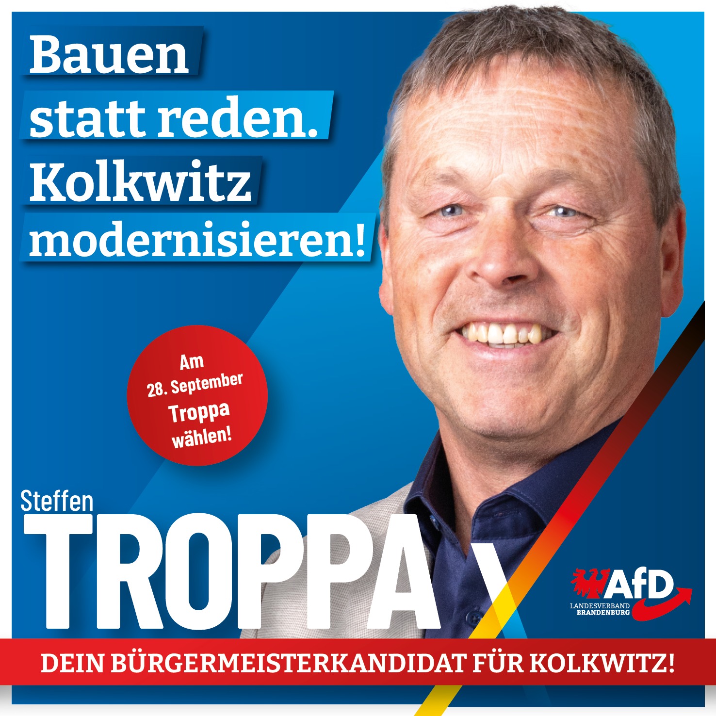 Genug geredet. Schulen, Straßen, schnelles Netz – Kolkwitz braucht keine Konzepte auf dem Papier, sondern Taten auf der Baustelle. Los geht’s! Am 28.9. Troppa wählen!