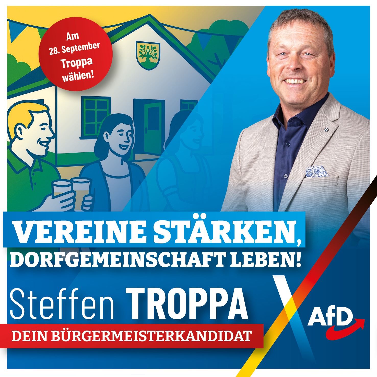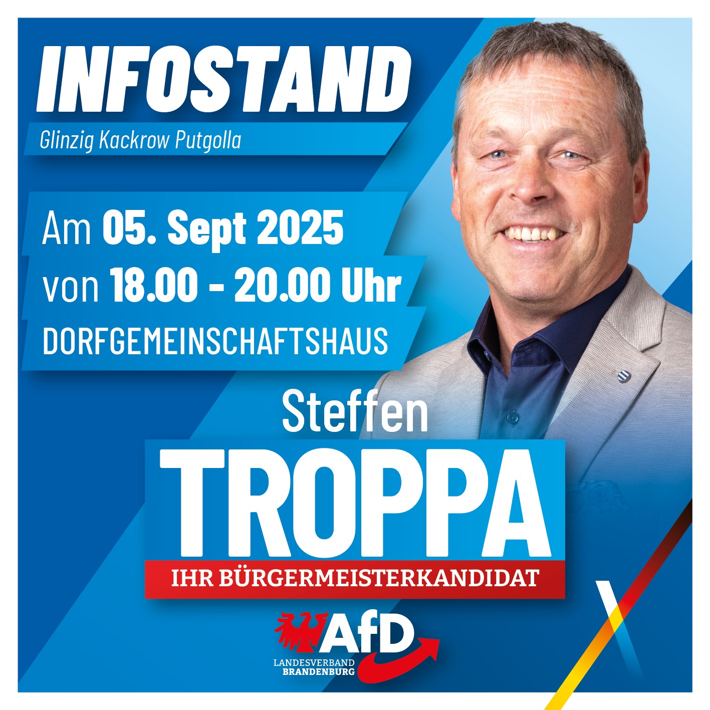 Lernen Sie Steffen Troppa kennen!Am 05. September ab 18 Uhr begrüßt er Sie mit AfD-Kollegen am Dorfgemeinschaftshaus in Glinzig.Kommen Sie vorbei, stellen Sie Ihre Fragen und sprechen Sie mit uns