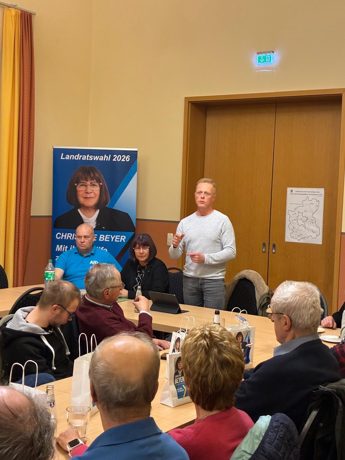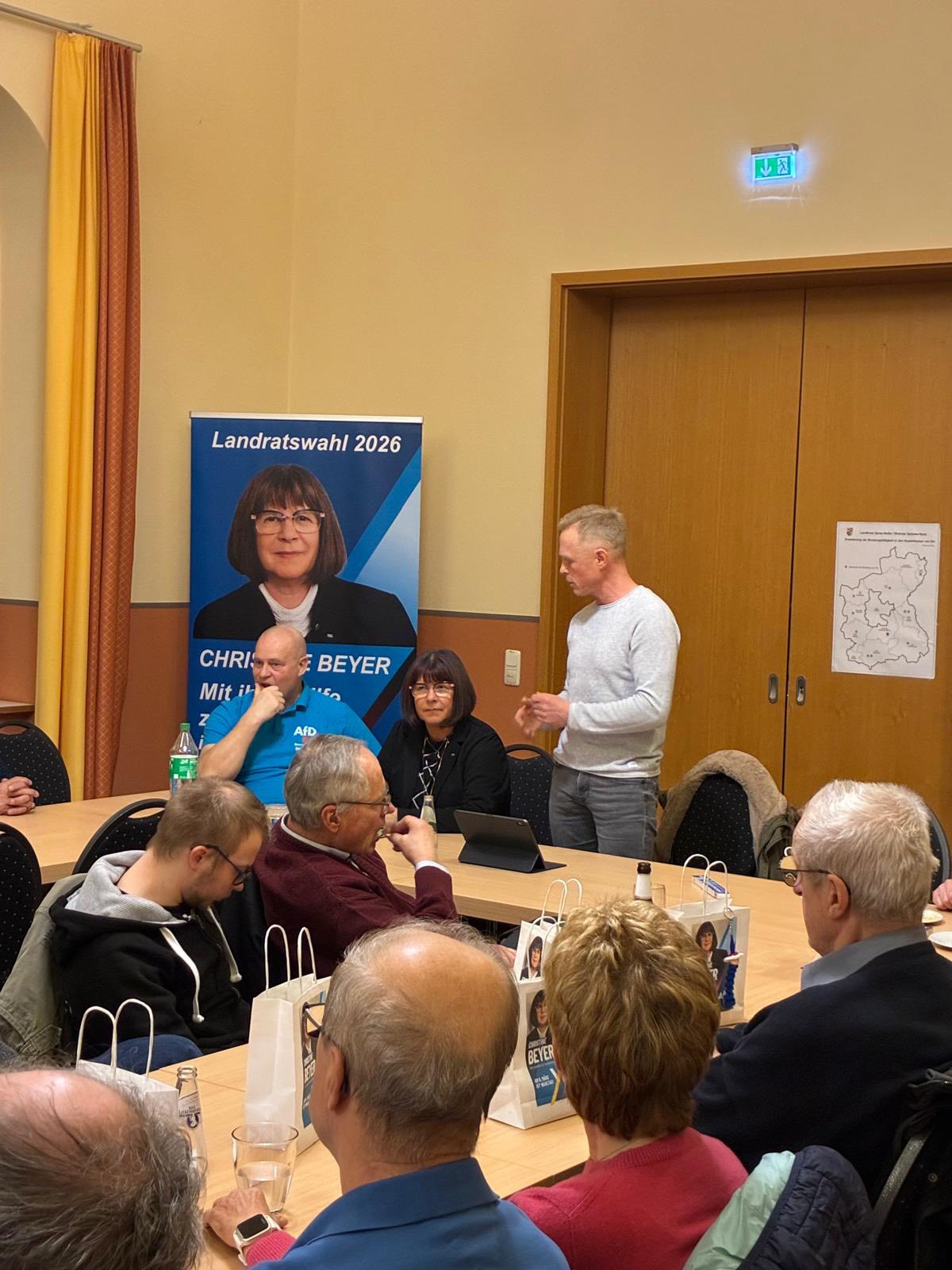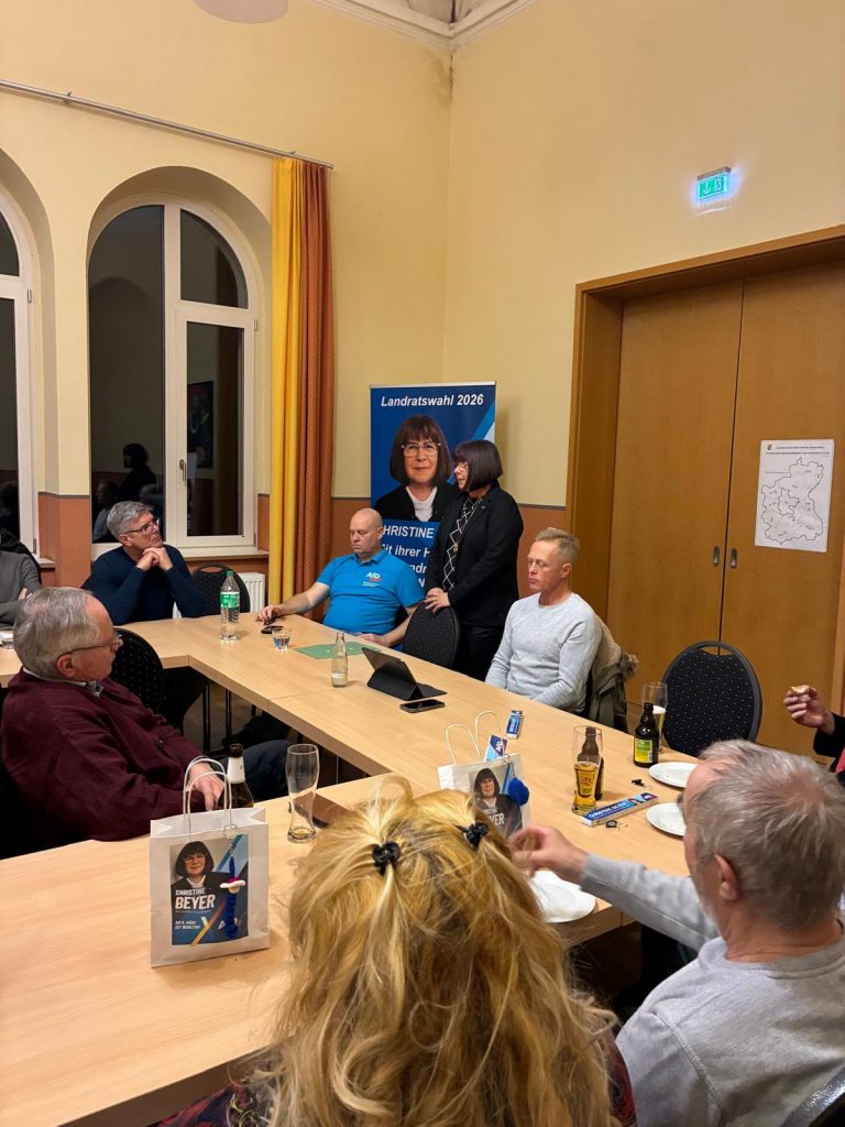 Landratskandidatin Christine Beyer stellte ihre inhaltlichen Schwerpunkte vor und ging auf aktuelle Herausforderungen sowie konkrete Vorhaben ein. Im anschließenden offenen Austausch wurden viele Fragen gestellt und unterschiedliche Anliegen sachlich diskutiert.