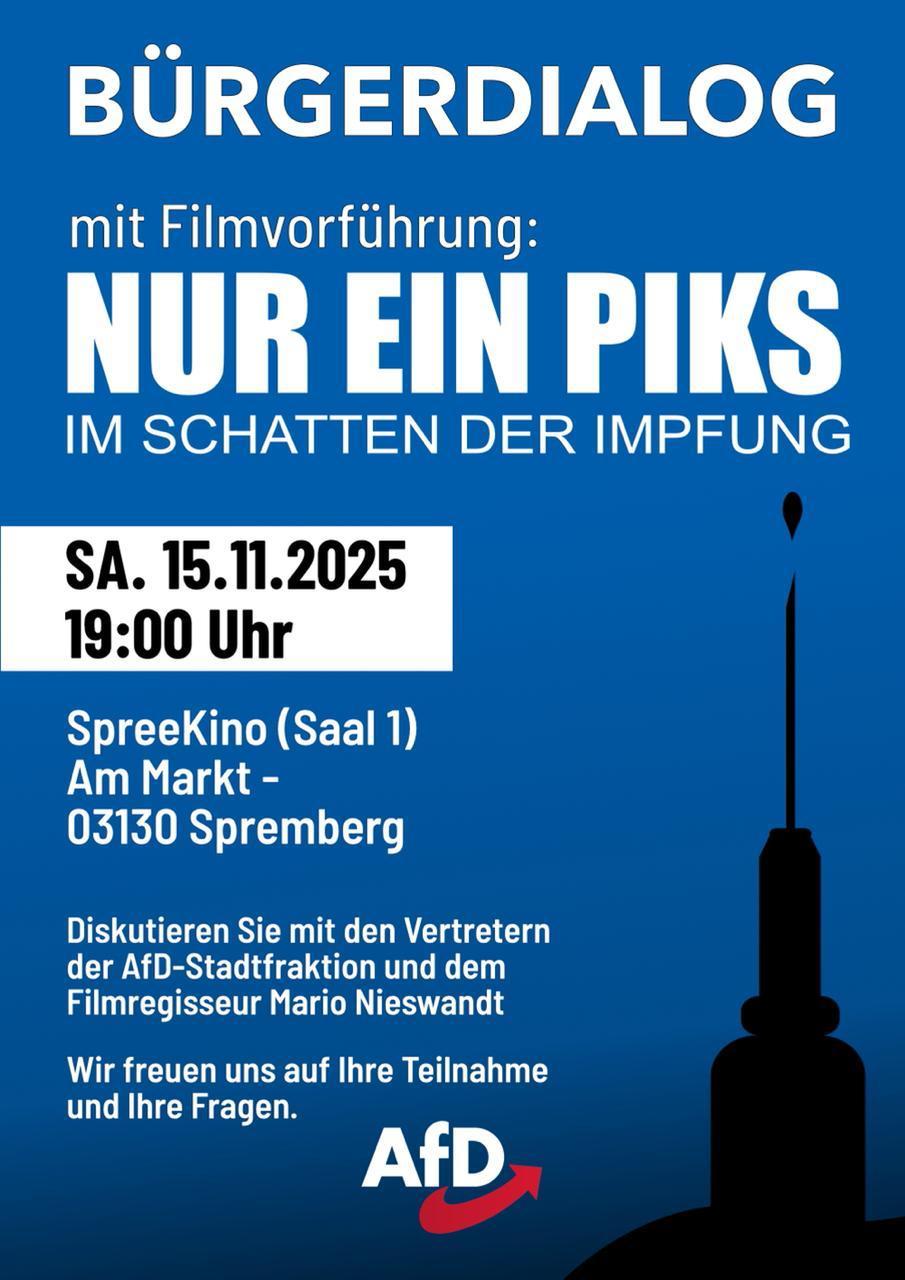 15.11.2025 | 19.00 Uhr | Spreekino (Saal 1), Am Markt, 03130 SprembergWas passiert nach dem kleinen Piks? Der Film „Nur ein Piks – Im Schatten der Impfung“ wirft einen kritischen…