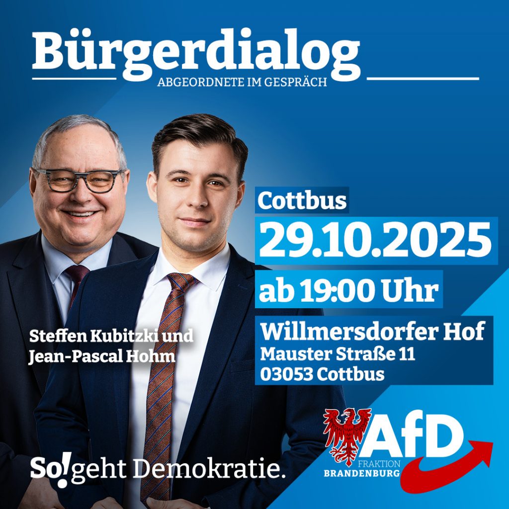 Am 29.10.2025 stehen Jean-Pascal Hohm und Steffen Kubitzki in Cottbus Rede und Antwort. Wir hören zu, nehmen Eure Sorgen ernst und bringen Lösungen auf den Tisch. Politik muss ehrlich und direkt sein-keine Ausreden.