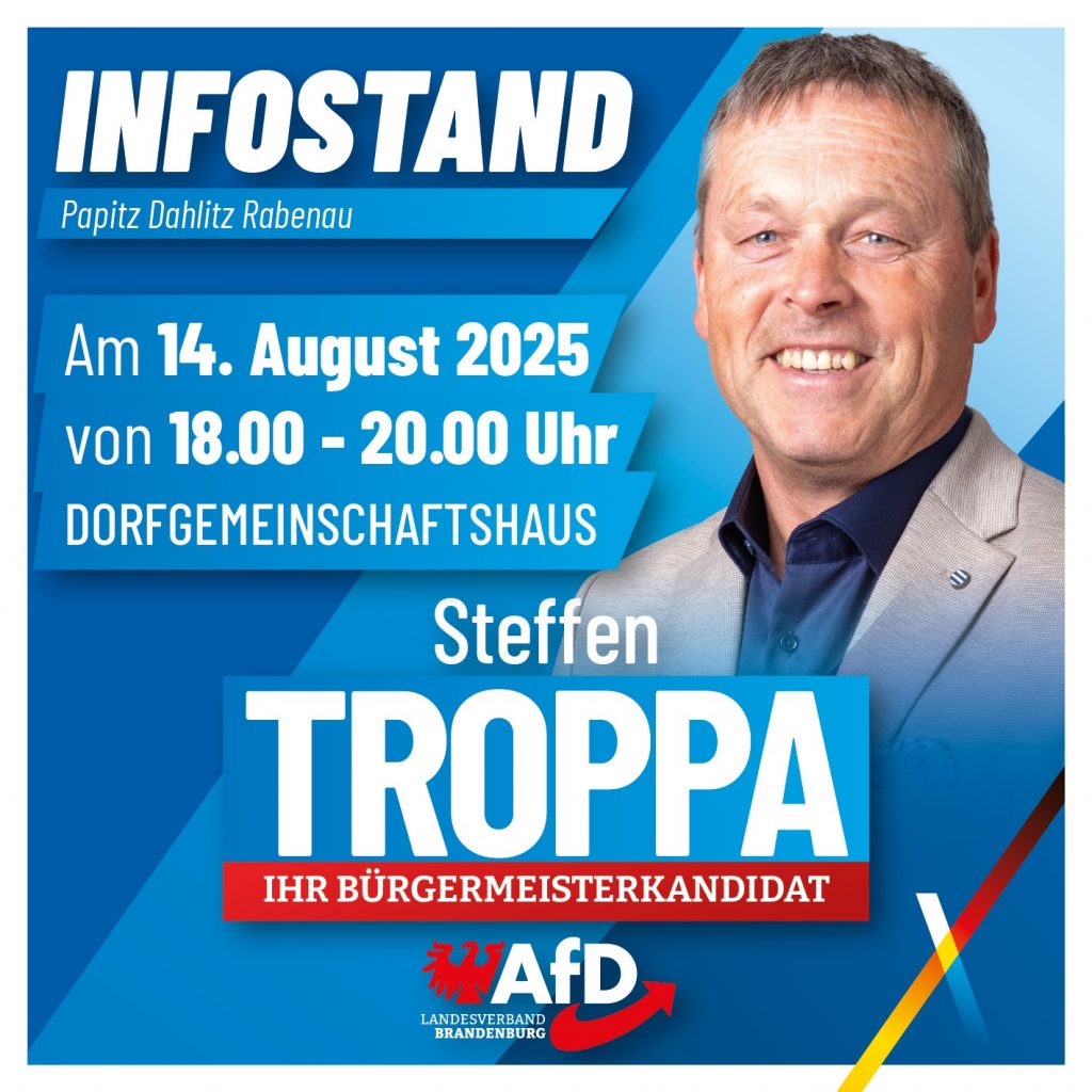 Am 14. August ab 18 Uhr mit unserem Kandidaten Steffen Troppa beim Dorfgemeinschaftshaus!