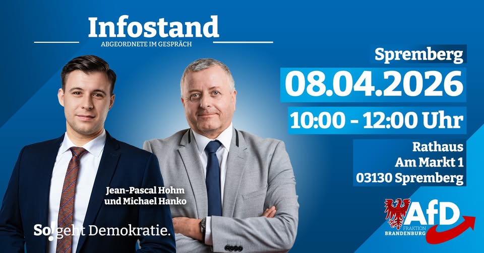 Am Marktplatz vor dem Rathaus in Spremberg findet ein Infostand mit den Abgeordneten Jean-Pascal Hohm und Michael Hanko statt.