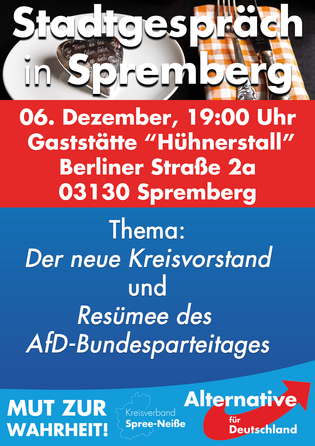 Wir laden Sie recht herzlich zum Wahlkampfhöhepunkt in das Hotel Georgenberg nach Spremberg ein. An diesem Abend wird sich ihr Landratskandidat für Spree-Neiße, Steffen Kubitzki, Ihnen vorstellen und sein Programm für Spree-Neiße präsentieren. Als Gesprächspartner wird an diesem Abend auch der Landtagsabgeordnete und Stellv. Fraktionsvorsitzende der AfD-Landtagsfraktion von Brandenburg, Thomas Jung, vor Ort sein. Freuen […]